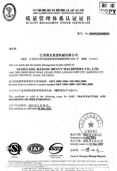Desde 2006, hemos sido miembros de la Asociación de Forjadores en China (Número de certificado: 6000125, fecha de expiración: 2013).